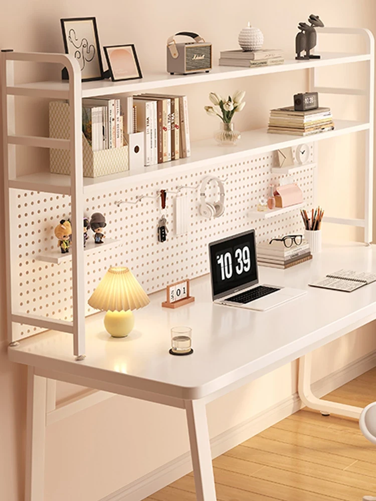 White Metal Standing Computer Desk with Pegboard - Multi-Layer Desktop Storage Rack and Bookshelf for Organized Workspaces