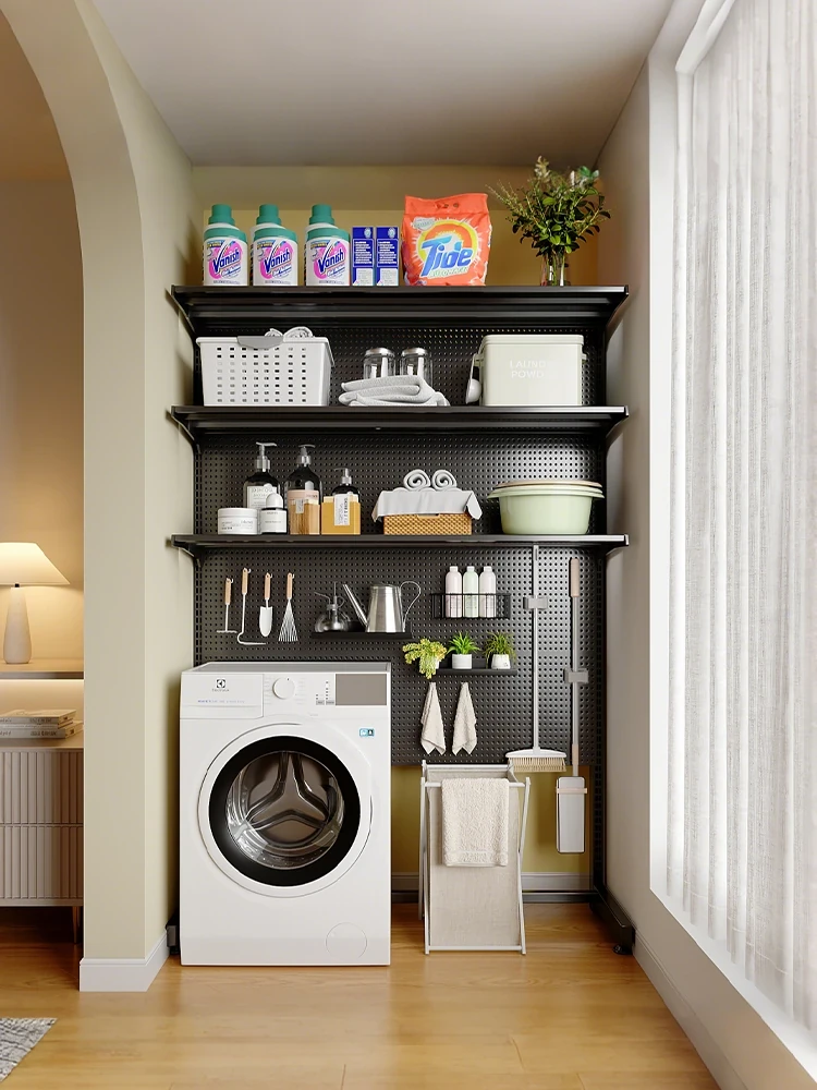 Multi-Layer Vertical Storage Rack for Balcony - Over Washer Pegboard Organizer for Laundry Detergent and Cleaning Supplies, Perfect Space-Saving Solution!