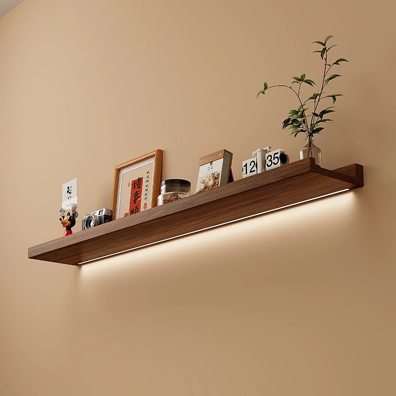 LED No-Drill Floating Shelf - Solid Wood Wall-Mounted Display Rack for Living Room, Perfect for TV Walls and Home Decoration