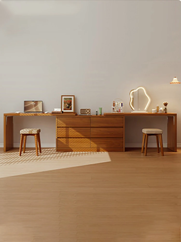 アンティーク風の無垢材デスク - 家庭用寝室にぴったりな収納付きドレッサー兼用、角型デザインで二人用のコンピューターデスクとしても最適!