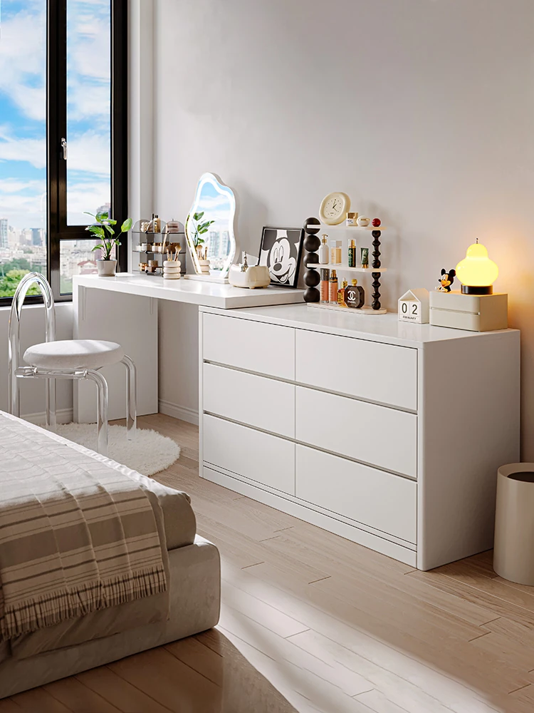 シンプルでモダンな化粧台一体型ドレッサー収納キャビネット - ベッドフット用クリームカラーの化粧テーブル、天然木製でおしゃれなインテリアを演出!