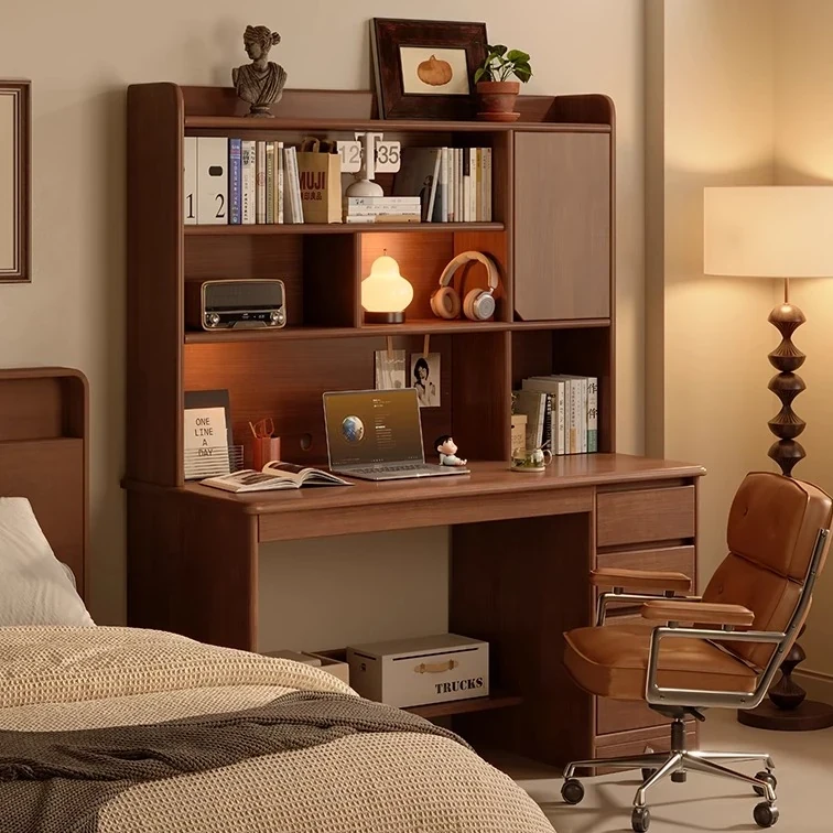 ヴィンテージ風の無垢材パソコンデスク - 家庭用・寝室・オフィスに最適!読書や学習にぴったりな一体型書斎デスク&シェルフ。おしゃれで機能的な空間を演出します!