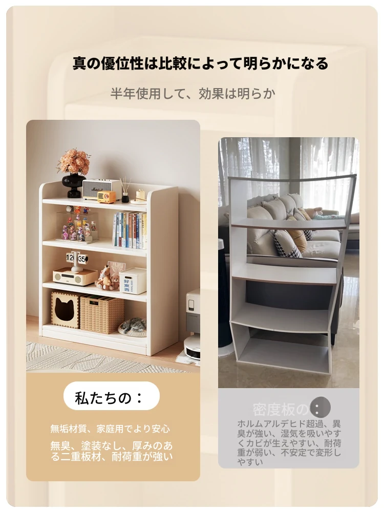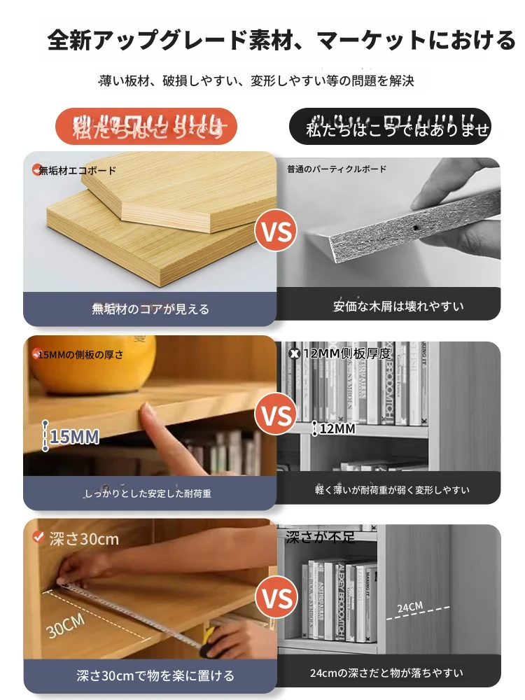 天然木材使用のスタイリッシュな書棚!地面に置ける壁寄せ収納キャビネット。学生に最適な多層構造で、整理整頓も簡単!お部屋を美しく整える収納力抜群の家具です。