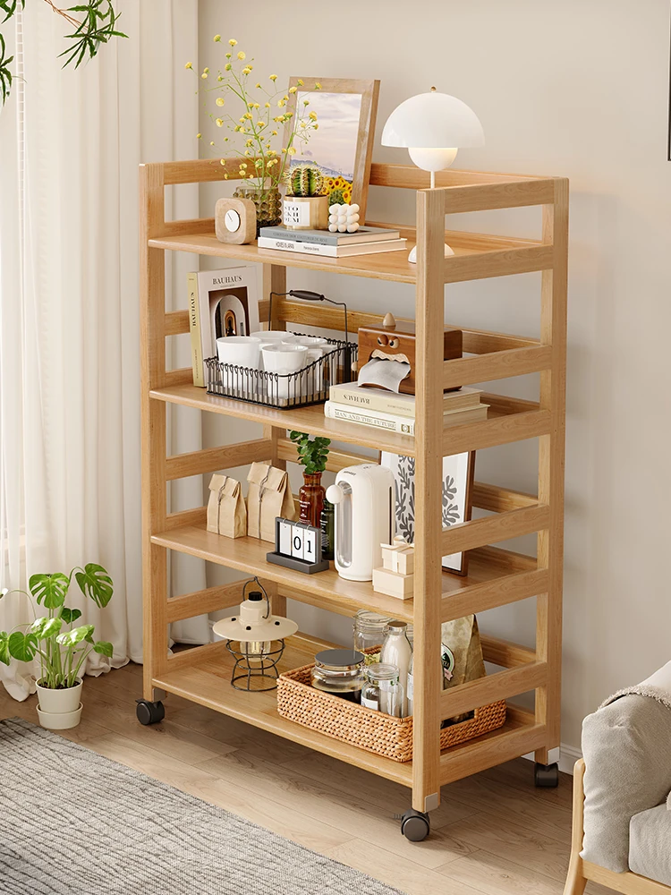 キャスター付き天然木製可動書棚 - 和風デザインの多段収納ラック、リビングや寝室に最適な小型ワゴン!おしゃれで便利な収納スペースを実現!