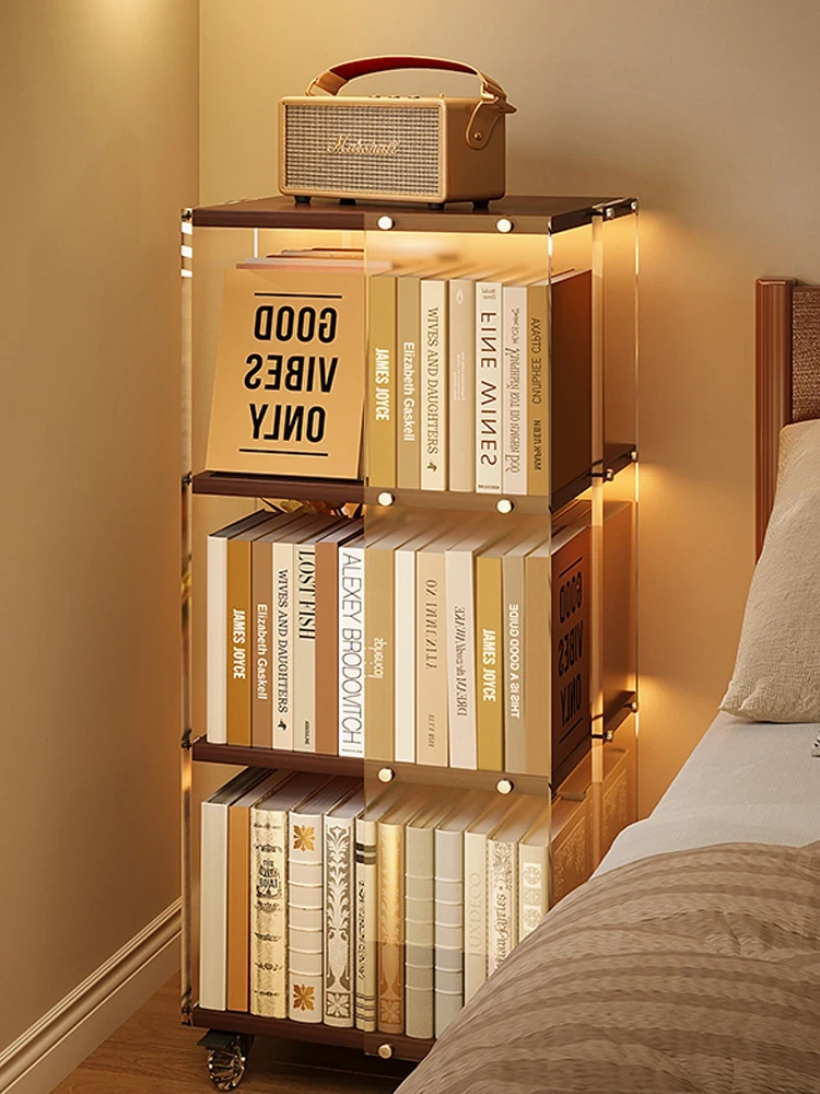 デザイン性抜群のアクリル製移動式無垢材ナイトテーブル!おしゃれな子供部屋や寝室にぴったりな収納ラック。使い勝手も抜群で、あなたのライフスタイルを彩ります!