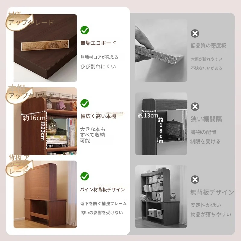 天然木材使用のスタイリッシュなデスク&書棚一体型!学生や家庭用に最適な学習・作業デスク、寝室にもぴったり。壁にぴったり収まるデザインで、快適なコンピュータ作業をサポートします。